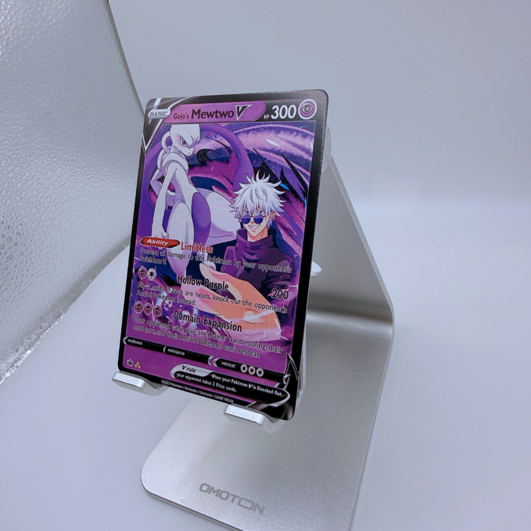 Experience the ultimate crossover between Jujutsu Kaisen and Pokémon with this custom Gojo’s Mewtwo V card! Inspired by Gojo Satoru’s Limitless Cursed Energy and Mewtwo’s unmatched psychic abilities, this card is a must-have for collectors and anime fans alike.