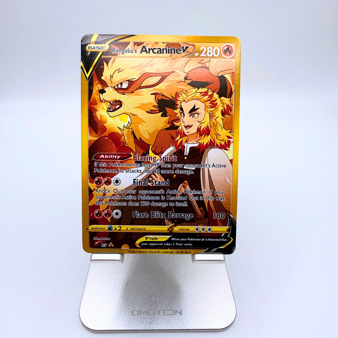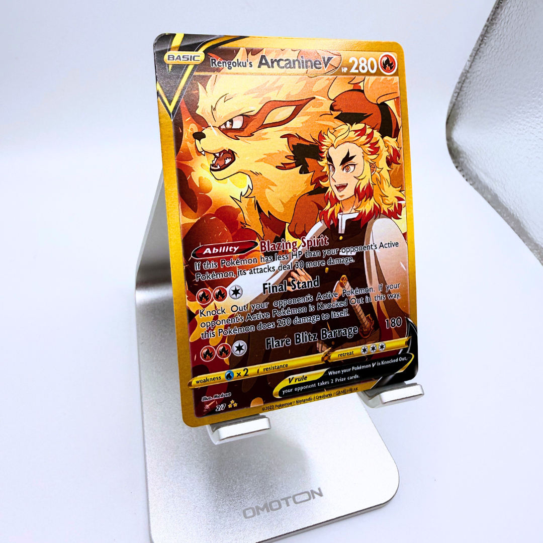 Witness the ultimate fusion of Demon Slayer and Pokémon with this custom Rengoku’s Arcanine V card! Inspired by Kyojuro Rengoku’s unwavering spirit and Arcanine’s legendary firepower, this card is a must-have for collectors, anime fans, and fiery competitors alike.